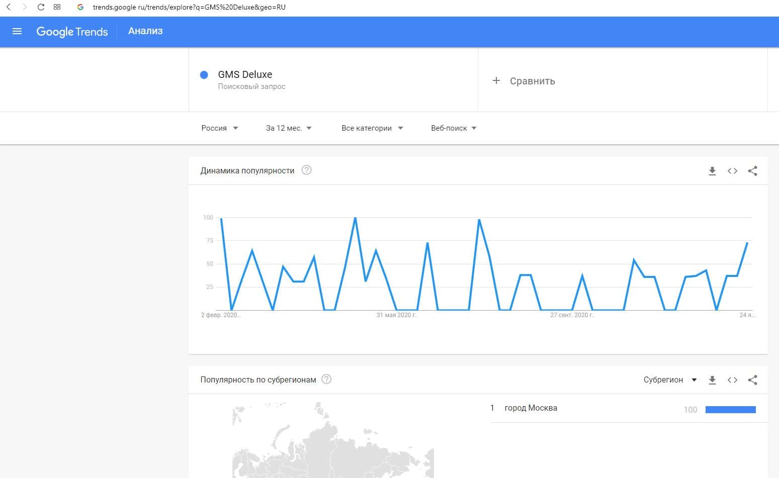 Динамика популярности запросов по бренду названия компании на английском языке "GMS Deluxe" на Гугл Трендс отображена на графике предоставленном ниже.