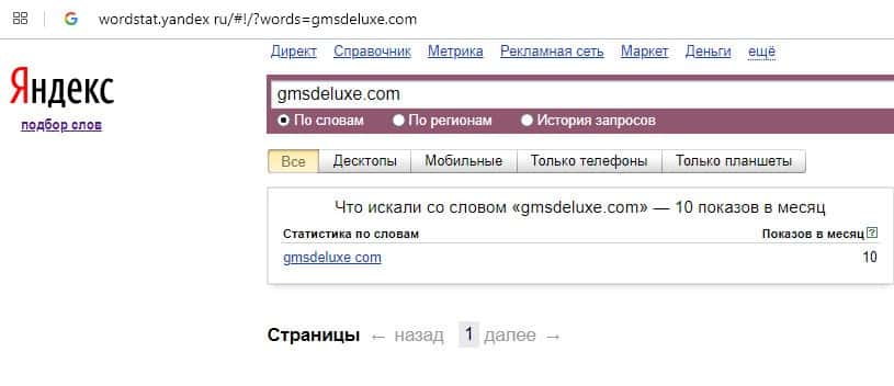 Количество брендовых запросов название домена компании "gmsdeluxe.com" на wordstat yandex ru составляет 10 показов за месяц.