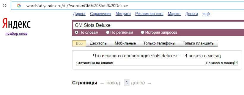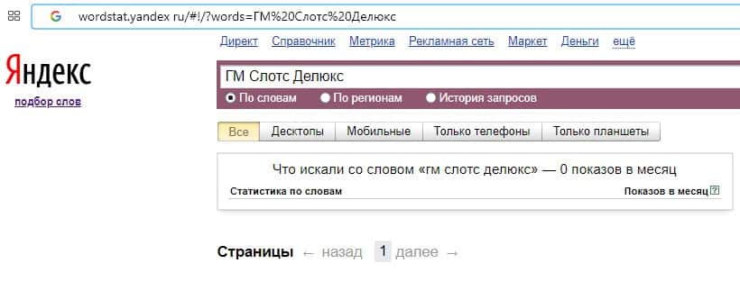 Количество брендовых запросов названия компании на русском языке "ГМ Слотс Делюкс" на Вордстарт Яндекс Ру вероятно равно нулю.
