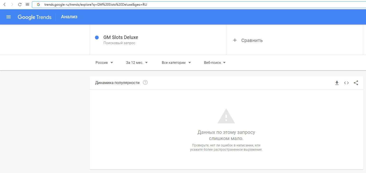 О количестве брендовых запросов полного англоязычного названия компании "GM Slots Deluxe" на Трендс Гугл Ру нет никакой информации.
