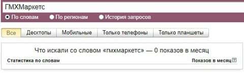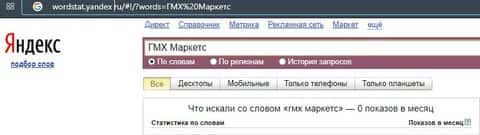 Что касается бренда мошенников "ГМХМаркетс" в другом виде, то здесь другая ситуация ситуация согласно системе Яндекс.Вордстат и бренд набрал 0 показов за месяц.