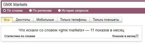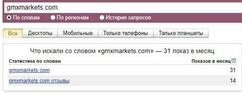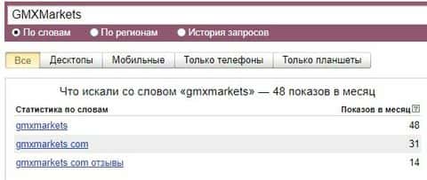 Если рассматривать поиск самого бренда "GMXMarkets", то система Яндекс насчитала около 48 показов за месяц.