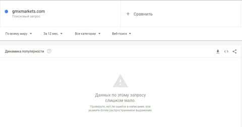 Та же ситуация и с обычным сайтом "gmxmarkets.com", данных о котором в запросах Гугл Трендс не было обнаружено.