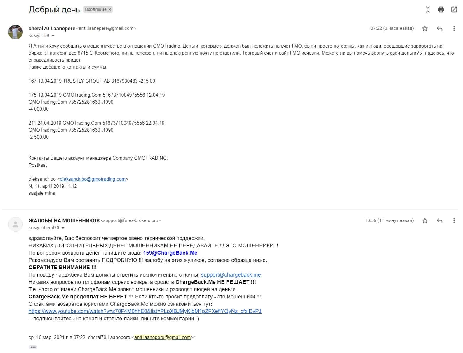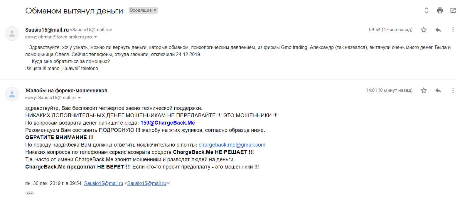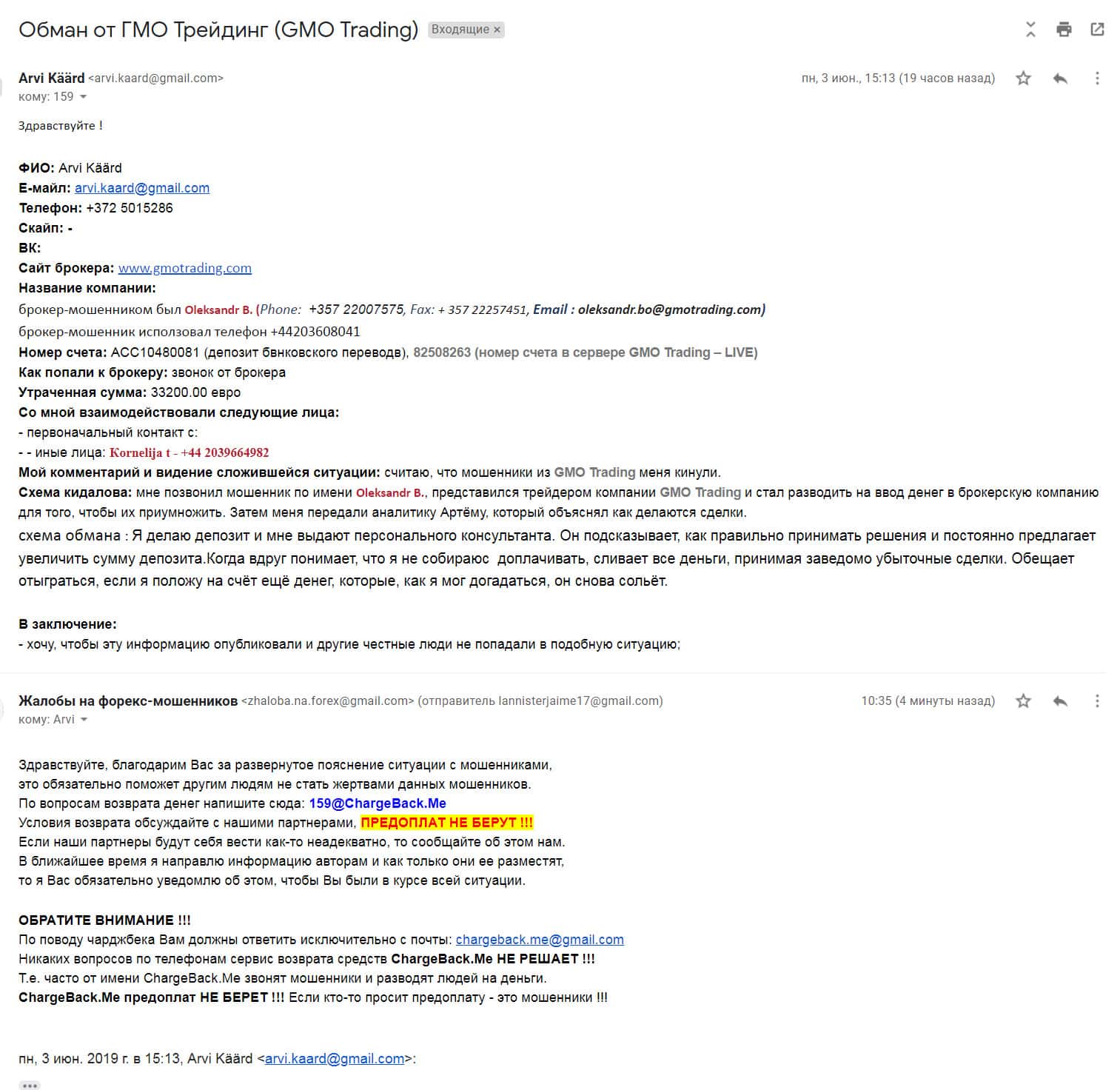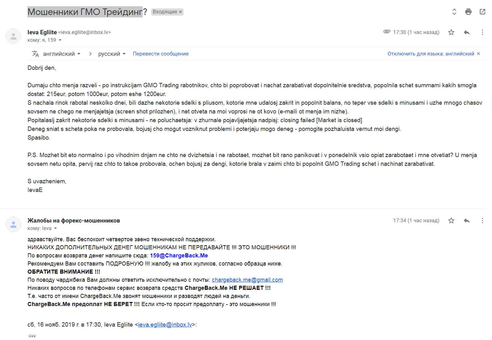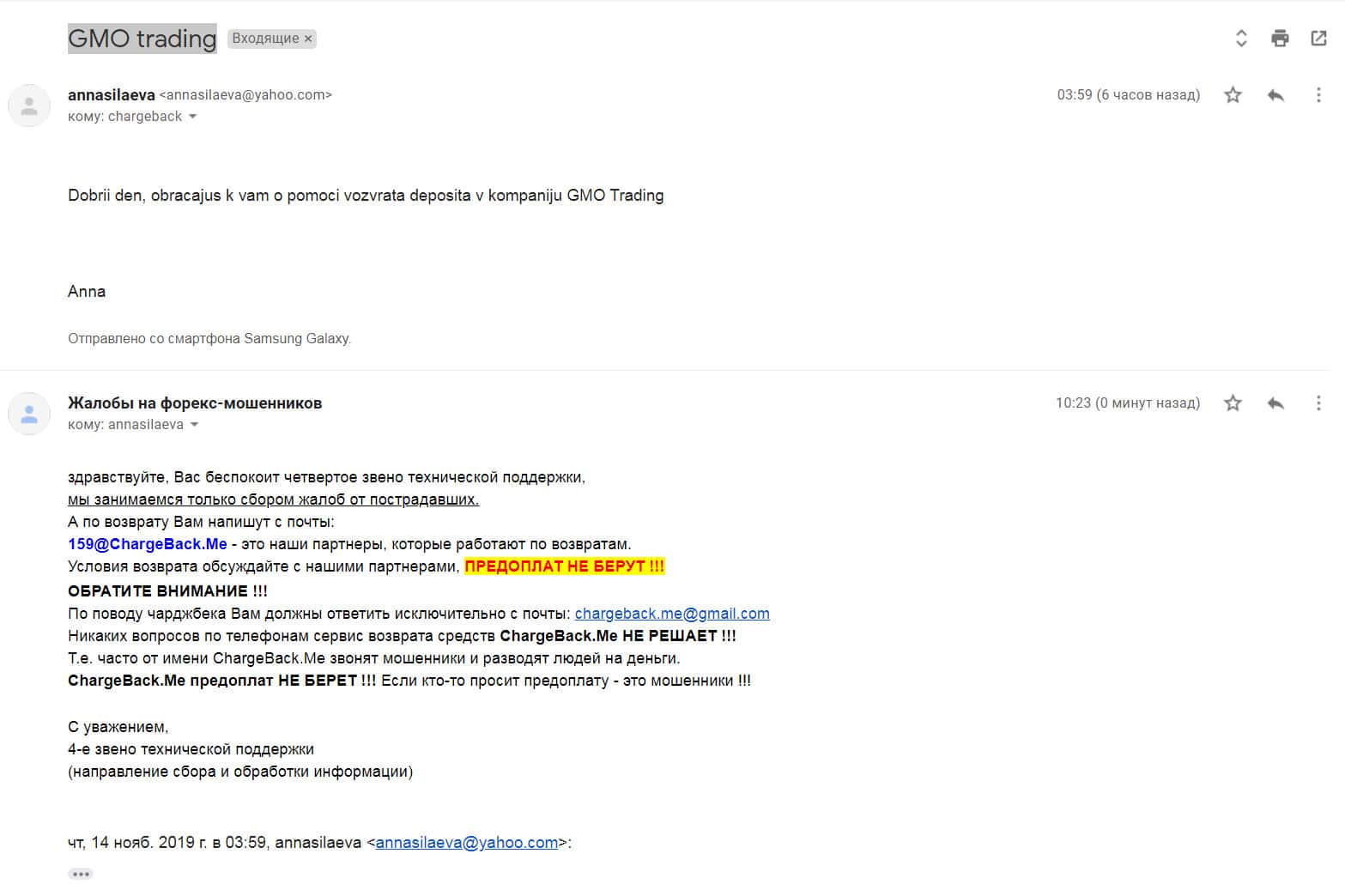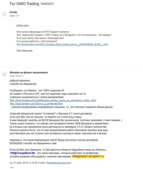 Далее приставлено первоначальное письмо, которое прислал жертва кидалова мошенниками ГМО Трейдинг.