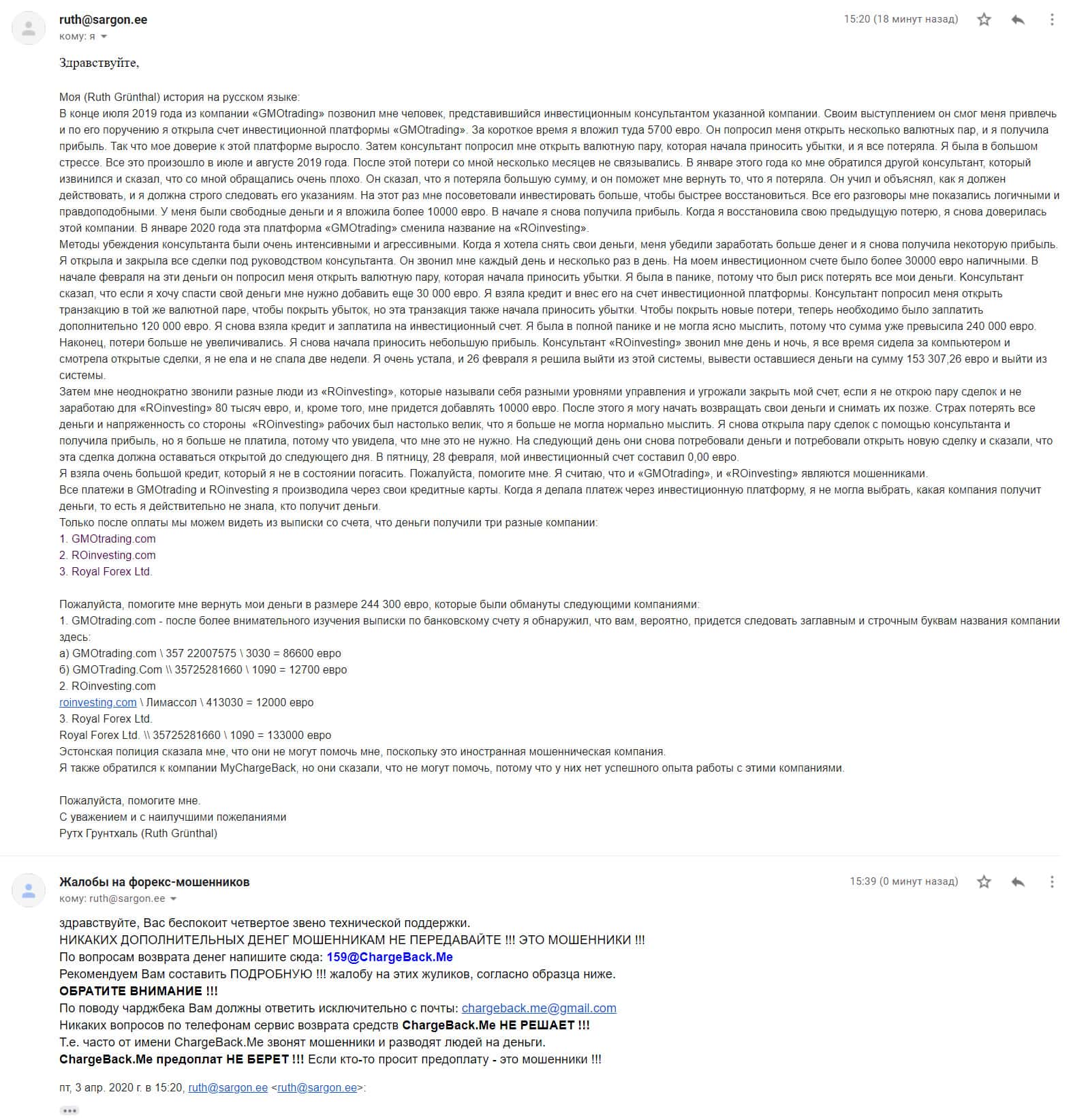 Далее предлагаем ознакомится с примечательным информационным материалом, автором которого является один из пострадавших клиентов скаммерских проектов ГМО Трейдинг, Ро Инвестинг, РоялФорекс, из-за которых человек лишился 244 300 евро.
