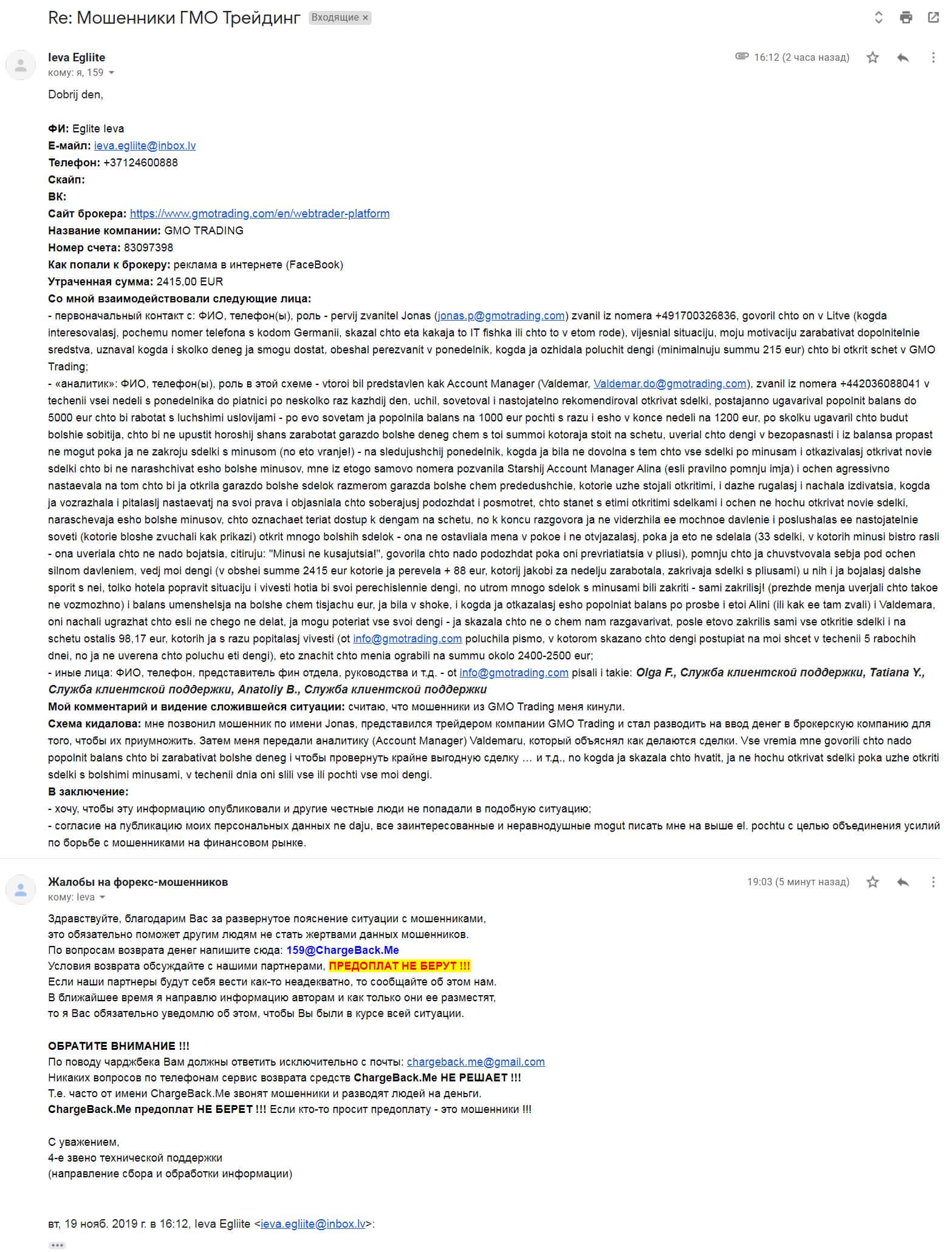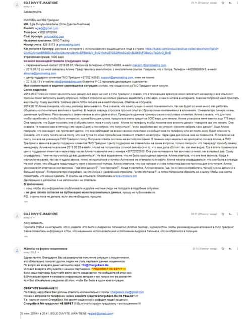 Ниже представлено письмо от человека, который прислал нам первоначальную жалобу на дилинговую кухню ГМО Трейдинг.