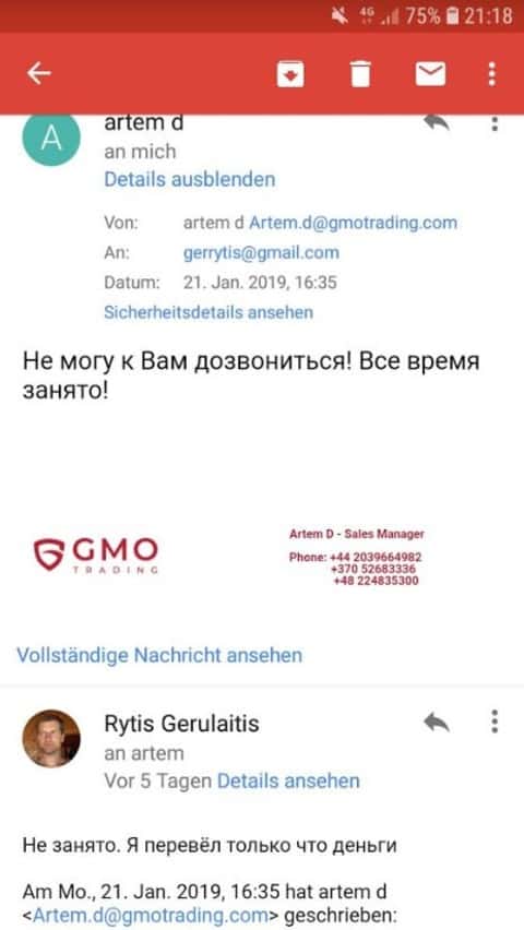 Далее представлена еще одна жалоба на дилинговую кухню под названием GMO Trading. Парень рассказывает, что ему написали аферисты на почту, с предложением заработать хорошие деньги. Клиент согласился, после чего зарегистрировался на сайте жуликов. Спустя некоторое время шулеры перестали выходить на связь, забрав с собою 2500 евро жертвы.