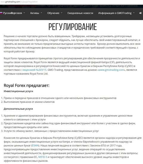 Согласно информации, которую мошенники дилинговой кухни ГМО Трейдинг предоставили на официальном сайте, конторой управляет организация под названием Royal Forex LTD. Она зарегистрирована на Кипре, лицензирована и регулируется Комиссией по ценным бумагам и биржам Республики Кипр, она же CySEC. Интересно то, что данная регуляция действует на территории этого же государства и если вы вложите деньги в контору из Российской Федерации, и контора не захочет вам их отдавать по своим причинам, то в суд подать на нее вы не сможете. Потому что компетентный суд находится на Кипре, да еще и в оффшорах. Пока вы туда доберетесь деньги уже будут в другой точке земного шара. Следовательно можно считать данную лицензию липой по отношению к стране в которой контора проводит жульническую деятельность.
