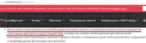 Жулики брокерской организации ГМО Трейдинг уже заблаговременно увиливают от ответственности, если даже обратить внимание на один из первых разделов Клиентского соглашения. Согласно ему компания не несет ответственности за любой ущерб или любые убытки, который вы можете понести в результате их действий и бездействия. То есть тут сказано, что все чтобы они не делали или делали с вашим счетом, в любом случае отвечать будете вы без разбора, а это основное что самое ценное во всех взаимоотношениях между брокером и клиентом.
