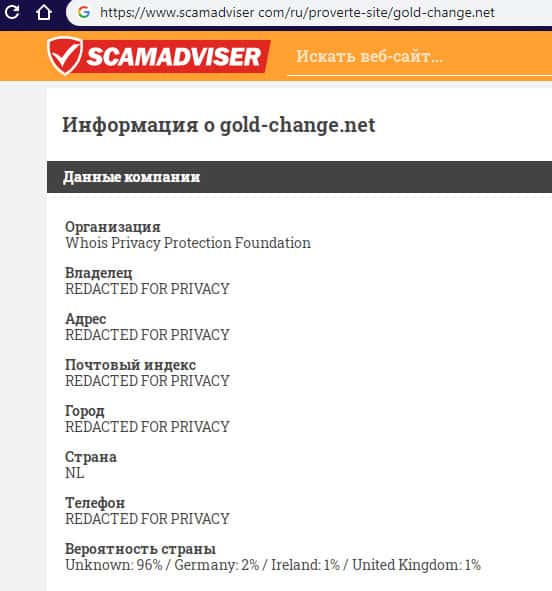 Техническую информацию о деятельности подвального сайта мошенников Gold-Change, а именно возраст, страну регистрации и местоположение сервера сайта аферистов Голд Чандж, можно узнать непосредственно с помощью портала scamadviser com. На изображении, расположенном ниже, вы можете наглядно увидеть информацию о сайте шулеров Gold-Change.