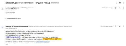 Письмо пришло с запросом на помощь в выводе средств из брокерской конторы GoldexTrade. Шарлатаны втерлись к человеку в доверие, навешали лапши на уши, а теперь еще и отказываются возвращать ему вложенные средства. Они обосновывают свое поведение тем, что нужно отработать бонусы, которые в принципе человек не просил. Короче говоря мошенники поставили невыполнимые условия, дабы присвоить деньги клиента навсегда.