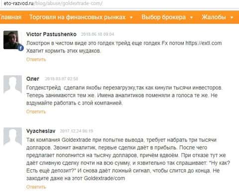 Блок негативных отзывов о мошеннической конторе Голдекс Трейд
