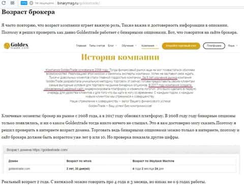 Еще интересно знать, что компания Голдекс Трейд позиционировала свой возвраст и начало работы с 2008 года. Но на самом деле контора потом начинает съезжать, что она обновила платформу и свой сайт и 9 лет как корова языком слизала. И сам домен сайта если пробить, то там возраст около 2-4 года. Так что сказки про 2008 год можно было впаивать только лохам.