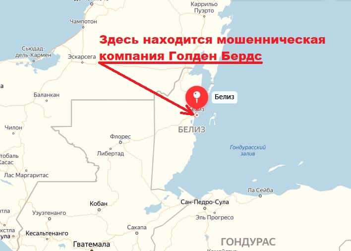 Государство Белиз в Центральной Америке, где в международной оффшорной зоне скрывается и прячет добытые незаконным путем денежные средства мошенническая игровая инвестиционная компания Golden-Birds Biz. Не рекомендуем связываться с этим шулерским онлайн-проектом.