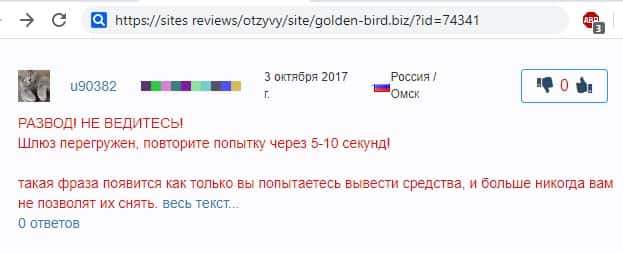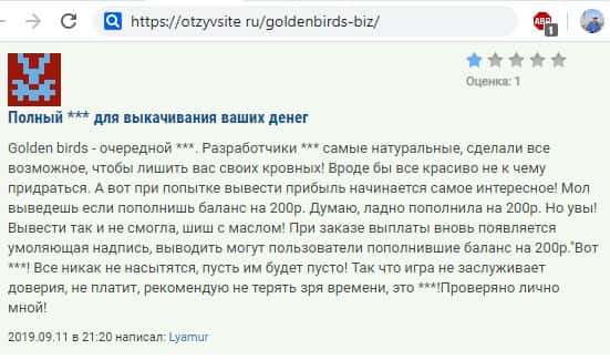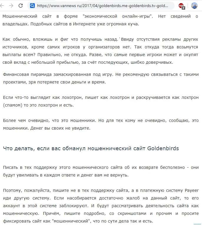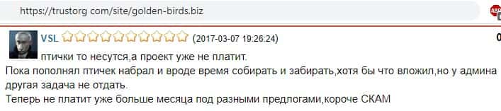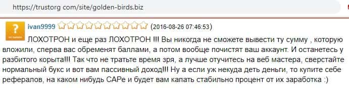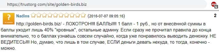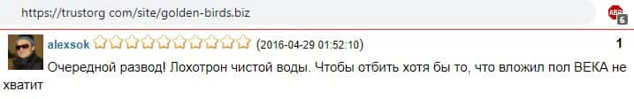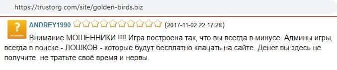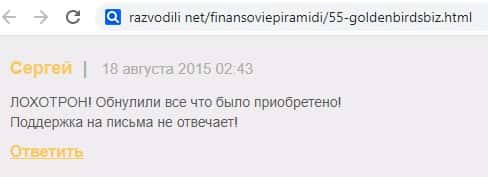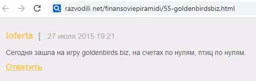 - Не ведитесь на развод мошенников из компании Golden-Birds - предупреждает опытный игрок на сайте sites reviews