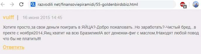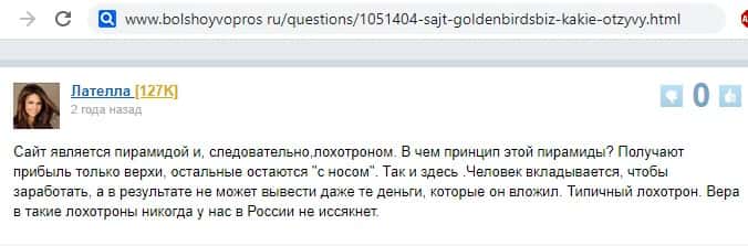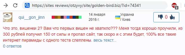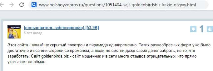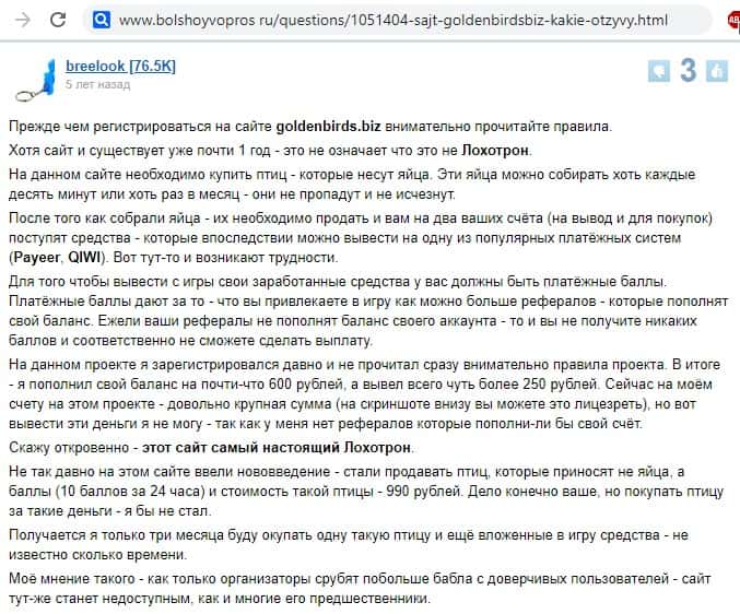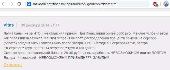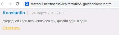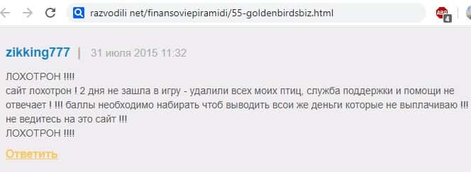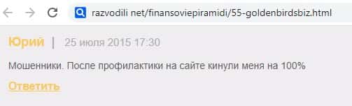 На информационном веб-ресурсе bolshoyvopros ru опубликован негативный отзыв обманутого участника экономической онлайн-игры Golden-Birds Biz, который заявляет, что подобных мошеннических ресурсов в Интернете предостаточно, и многие из них уже со временем соскамились. Подобная судьба ждет и новый проект.