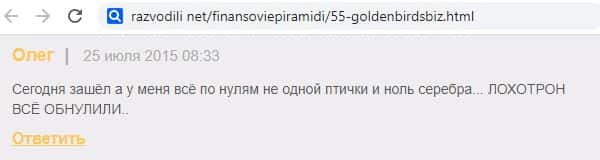 Пользователь мошеннической игровой интернет-компании Golden-Birds Biz написала отрицательный отзыв на информационном сайте razvodili net о том, что у нее по неизвестным причинам обнулились и игровые счета и численность пернатых.