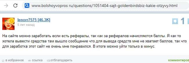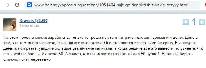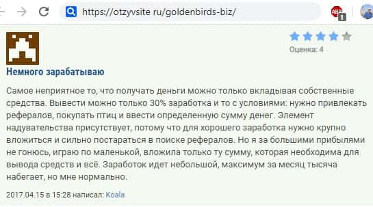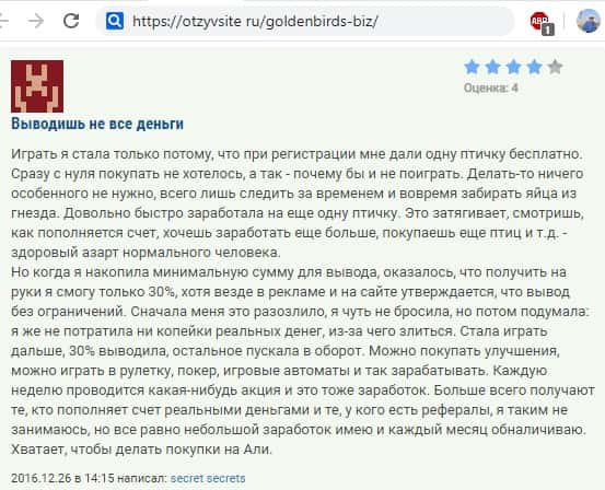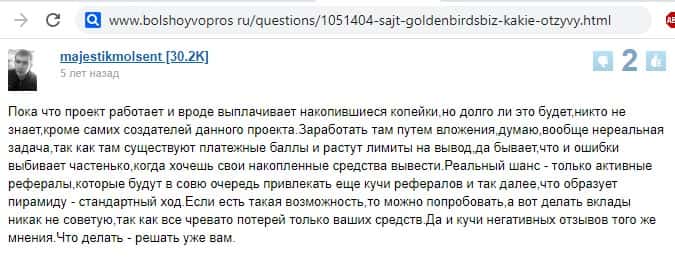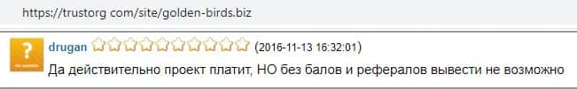 В общем-то достаточно добродушно настроенный игрок онлайн-ресурса Golden-Birds Biz, все таки признает, что в этом проекте присутствует элемент надувательства, для реального заработка нужно сделать довольно крупные вложения и организовать охоту за рефералами, а вывести все равно можно не более 30 процентов заработанных денег.