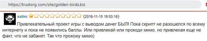 Автор видеообзора онлайн-игры Голден Бердс сообщает, что здесь без активных рефералов ничего не заработаешь. Вернуть можно только 60 процентов от платежных баллов, которые можно заработать только на рефералах. У сайта большое количество клонов. Организаторы сразу предупреждают, что проект создан не для заработка, а для развлечений. Здесь нельзя вывести больше, чем ввели. Не кормите мошенников.