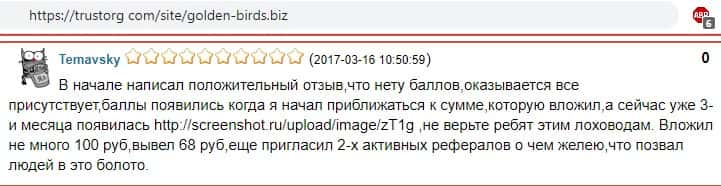 Участник мошеннического игрового онлайн-проекта Golden-Birds Biz сообщает на сайте trustorg com о том, вывести свои денежные средства из этой игры достаточно проблематично - для этого нужно собрать необходимое количество каких-то мифических баллов, а также заманить в игру несколько таких же доверчивых лохов.