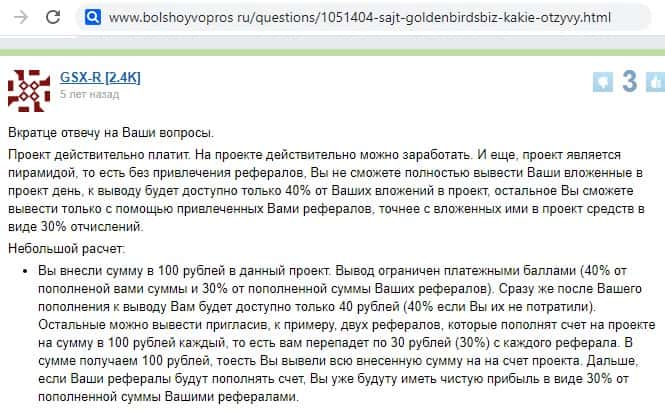 Участник игрового интернет-проекта Golden-Birds Biz в своем отзыве на веб-ресурсе bolshoyvopros ru отмечает, что в этой мошеннической игре нельзя заработать без привлечения рефералов, вложения которых могут быть положены в основу выплат, но это очень напоминает обыкновенную пирамиду, когда прибыль игроков формируется за счет последующих участников.