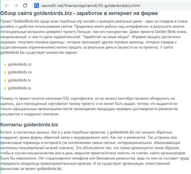- Игровой веб-сайт Golden-Birds Biz - это откровенный лохотрон и финансовая пирамида