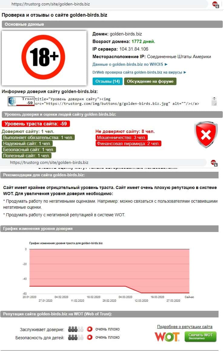 Эксперты информационно-аналитического веб-ресурса trustorg com, проанализировав официальный сайт игровой онлайн-компании Golden-Birds Biz, зарегистрированный в Соединенных Штатах Америки, пришли к выводу, что большинство пользователей не доверяют этому мошенническому ресурсу и не считают его надежным, полезным и безопасным.