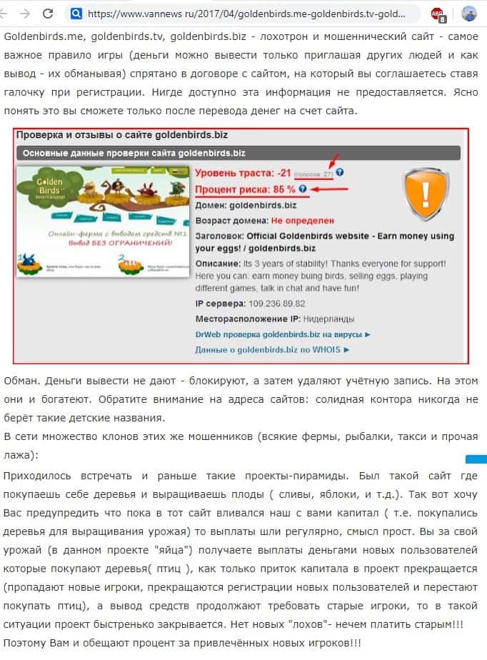 - Golden-Birds Biz - это мошеннический сайт в форме экономической игры, - к такому выводу пришли эксперты из vannews ru