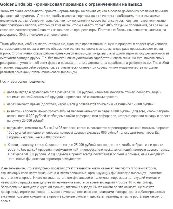 Бдительный интернет-пользователь, внимательно изучив грабительские условия онлайн-игры Golden-Birds Biz, решил не связываться с этими откровенными мошенниками и пройти мимо этого лохотрона.