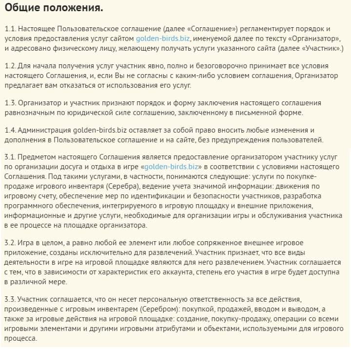 - Пользовательское соглашение игровой инвестиционной онлайн-компании Golden-Birds Biz
