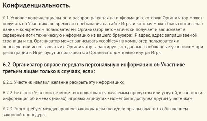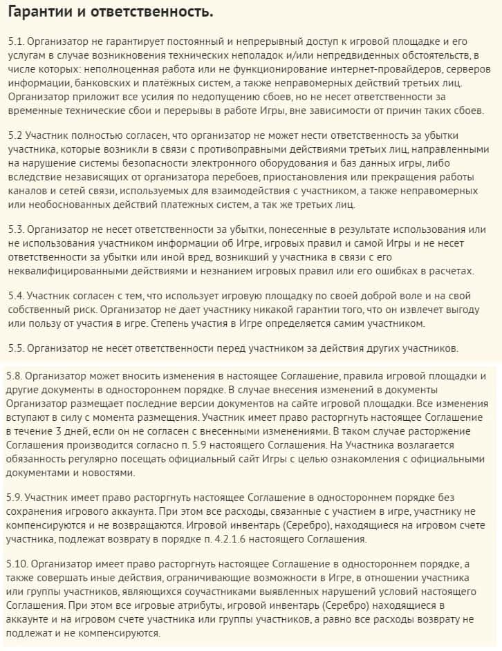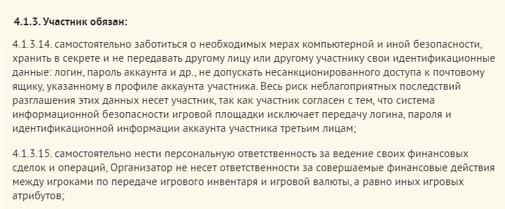Приведенные в Пользовательском соглашении обязанности участника игрового проекта Golden-Birds Biz предусматривают игроку самостоятельно заботиться о необходимых мерах компьютерной и иной безопасности, сохранности своих персональных данных, нести ответственность за совершаемые финансовые действия, при этом организатор никакой ответственности за это не несет.