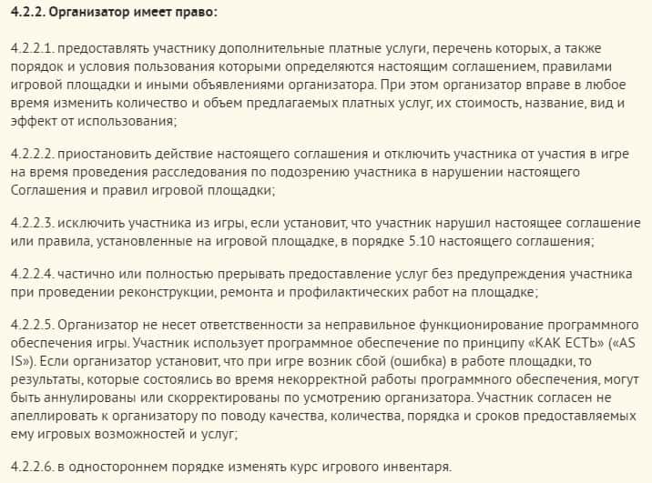 Мошенники из игровой компании Golden-Birds Biz наделили себя беспрецедентными правами, в том числе: предоставлять участнику дополнительные платные услуги, стоимость которых может быть в любой момент изменена, отключить участника от участия в игре, прерывать предоставление услуг без предупреждения, изменять курс игрового инвентаря, при этом они не несут ответственности за неправильное обеспечение игры.