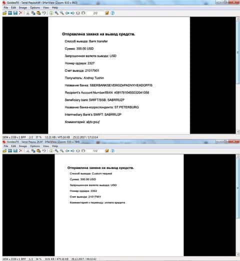 Судя по информации, которую нам прислал один из клиентов кухни Голден ФХ, контора достаточно похожа на скам-брокера, которых в интернете пруд-пруди. Человек вложил деньги в брокера еще в 2017 году, а вот забрать не может до сих пор. Поэтому просит нашего содействия и прикрепил скриншоты, которые доказывают наличие денег у него на счету, открытого в дилинговой форекс-шараге Golden-FX.