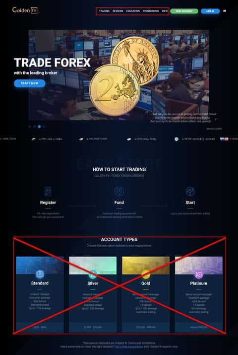 Как и все сайты форекс-брокеров, интернет-ресурс скам-конторы Голден ФХ golden-fx com начинается с завлекалова новичков и опытных трейдеров. Для новичков красочные картинки с деньгами и обещаниями о лучшем будущем, а для трейдеров торговые условия с различными условиями инвестирования. Короче говоря, промоушен работает качественно, дабы запудрить клиенту мозг, а потом прошуршать в карманах своих жертв. Также есть несколько разделов, которыми пользуются мошенники в процессе развода лохов - это Trading, Review, Education, Promotion и Info.