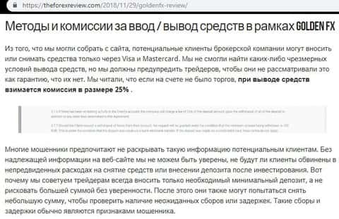 Следующий интернет-ресурс theforexreview com решил написать тоже статью о форекс-брокере Голден ФХ и подметил очень важную вещь. Оказывается, клиент, который вложил деньги и не совершил ни одной сделки, то контора снимает 25% комиссии от суммы вывода. Многие мошенники предрочитают скрывать данную информацию потенциальным клиентам, дабы не спугнуть. Ну а мы скажем больше - контора Golden-FX не выплачивает деньги вообще!