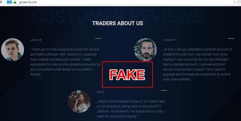 Ну и конечно же любимое занятие аферистов форекс-рынка - это клепать фейковые отзывы прямо на своем сайте. Мошенники Golden-FX даже не побоялись вставить фотографии из соц-сетей подставных людей и назвать их соответствующими именами. Так что все что там написано не имеет никакого реального смысла, а вот на товарищей на фотографиях зла не держите - они не виновны, что попались по жульбанскую лапу Golden-FX.