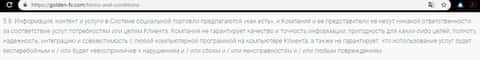 Согласно информации из следующего пункта, жулики Golden-FX не несет ответственность за все что написано на их официальном сайте, а также не гарантируют качество и точность информации. В добавок к этому ДЦ Голден ФХ не гарантирует, что услуги будут предоставляться бесперебойно, даже если в результате этих перебоев клиент потеряет деньги, то это вина самого клиента. Так что в любом случае по поводу проигрыша, виноват только клиент, а если прибыль, то делят ее согласно договору.