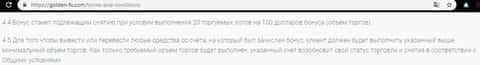 Следующий раздел договора вообще убивает любые надежды заработать и вывести деньги с открытого счета в конторе Голден ФХ. Оказывается, те бонусы, которые начисляются клиенту при первом депозите имеют достаточно другую специфику. Чтобы вывести 100 долларов, нужно как минимум совершить 20 сделок. Поэтому бонус это не всегда хорошо, и если уж вляпались, то лучше откажитесь от бонусной программы.