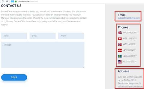 Контактная информация конторы Голден ФХ довольно обширная, так сказать, на международном уровне. То есть брокер ворует деньги по всему миру. Только понять, как туда попадают русскоязычные клиенты не понятно. Ведь телефоны, которые они представляют различных стран, но ни России. Вот соответственно и сами контакты: