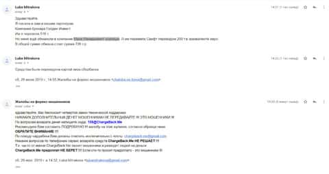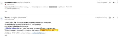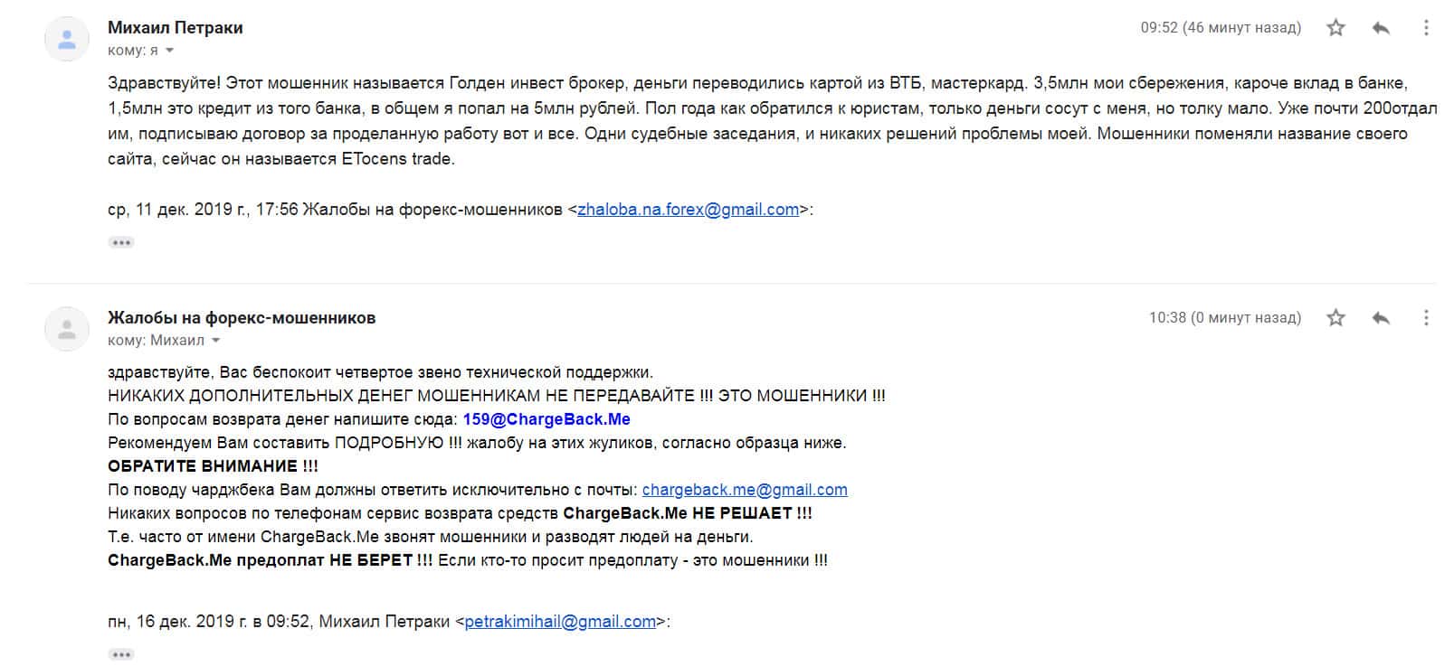 Пострадавший обратился за помощью в компанию ChargeBack.Me так как не понимает как ему вернуть средства из двух кухонь. Сначала он вложил свыше 500 000 рублей в лохотрон Голден Инвест Брокер, а потом удосужился еще попасть на удочку к аферистам Мани Менеджмент Коалишн, которые нагрели его на 200 000 рублей.