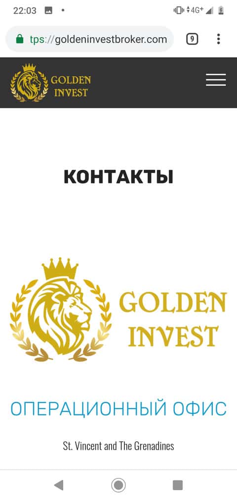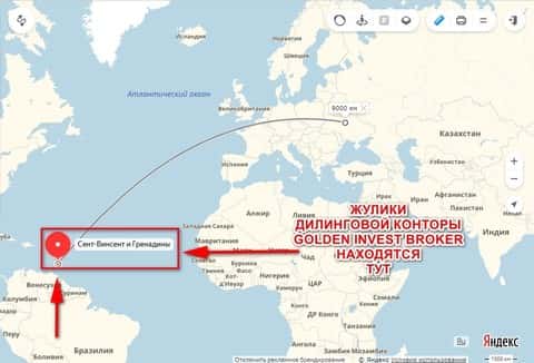 А это скриншот с сайта кухни Голден Инвест Брокер. Здесь мы можем заметить что контора зарегистрирована в оффшоре St. Cincent and The Grenadines.
