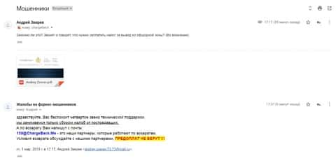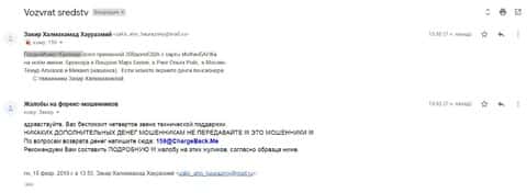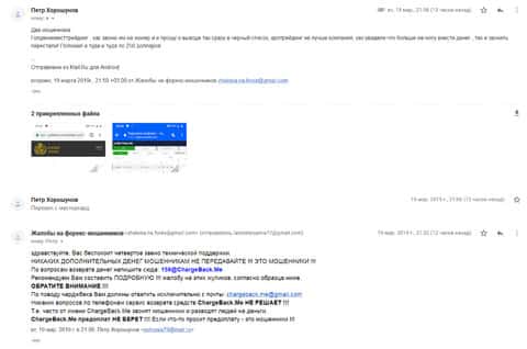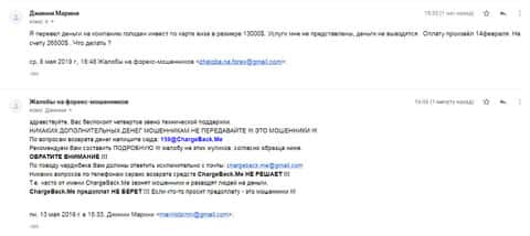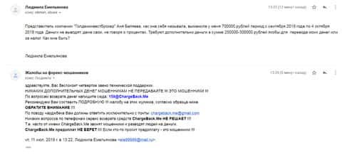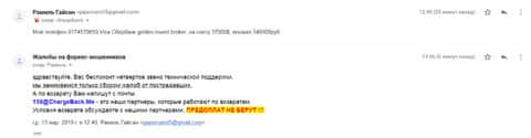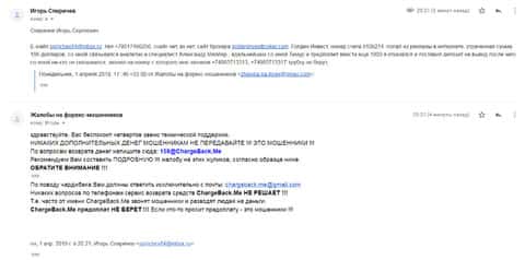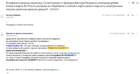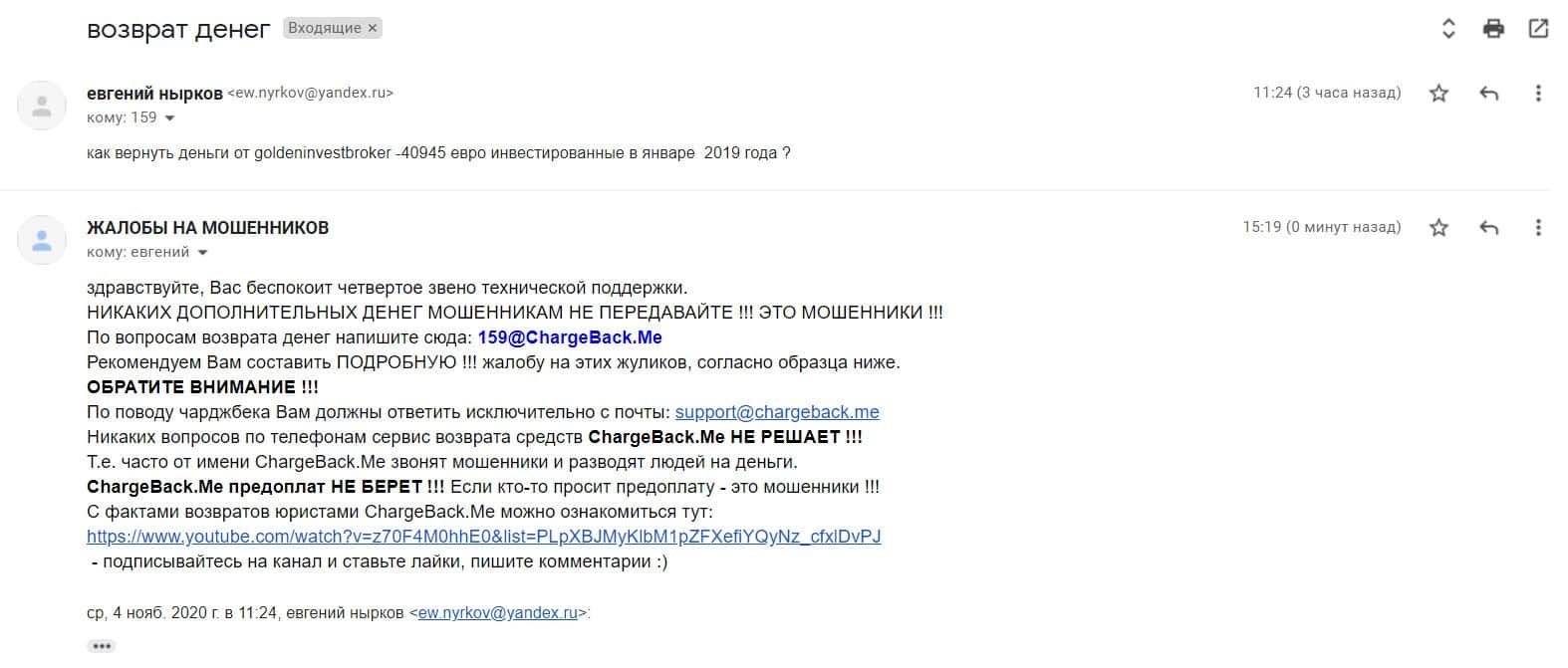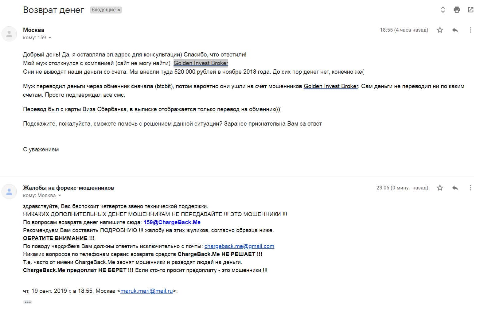 Развод со стороны лохотрона Golden Invest Broker начался со звонка афериста, который уговорил клиента вложить 250 долларов. Потом пошло-поехало. Тупые уговоры, демонстративное увеличения депозита и тут уже клиент отдал аж 500 000 рублей. Последней каплей был несуществующий налог, который он оплатил. Чтобы вывести деньги, жертва пошел по совету друга, который сказал написать в компанию ChargeBack.Me где обещали помочь.