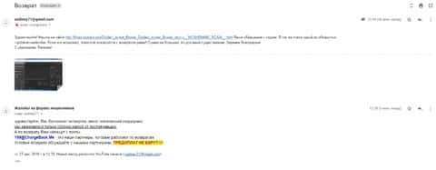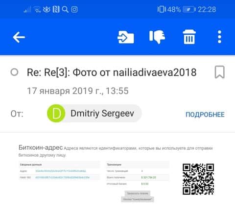 Следующим скрином представлен фейковое перечисление средств в биткоинах конторой Голден Инвест Брокер. Они нашли левый адрес с 300 000 долларов и прислали клиентке, типа смотри, все уже перечислено.