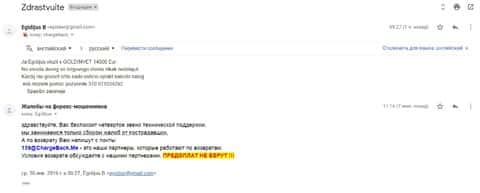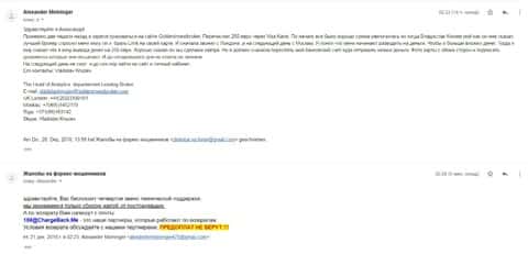 После того, как женщина передала все данные, в организацию ChargeBack.Me которая пообещала помочь вернуть украденные деньги, она написала нам коротенькое письмо. В нем жертва рассказала как лохотрон Голден Инвест Брокер своровал 4500 долларов и теперь не желает возвращать ни копейки, заблокировав доступ к счету. Что только аферисты не придумывают, лишь бы уйти от темы вывода.