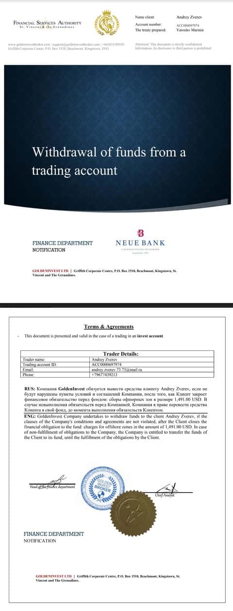 Один человек прислал нам письмо со вложением, где брокерская кухня Golden Invest Broker с которой он работает в данное время, просит у него оплатить налог за вывод его же средств из оффшорной зоны. Когда эти данные к нему пришли, то он сразу же стал сомневаться в добропорядочности брокера. Когда он подписывал с ними договор и переводил деньги на торговый счет, ничего о налогах не было сказано. Так что он намекает, что кухня Голден Инвест Брокер - тупой разводняк для лохов, на который не собирается вестись. А для того, чтобы вернуть вложенные деньги, он передал свои данные в организацию ChargeBack.Me где пообещали помочь.