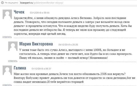 Автор следующего отзыва хоть и попала на 250 долларов, но все-таки вовремя включился мозг и она вышла из аферы. Конторщики запарили женщине мозги и заставили вложиться в компанию Golden Invest Broker для приумножения капитала. Но как оказалось потом, жулики стали все меньше звонить и каждый звонок сопровождался их недовольством и вымогательством. Они требовали от жертвы действовать и идти брать кредит. Брокер-аналитик Виктор Бобухов заставил взять кредит женщину и так то она взяла. Но вся-таки она поняла, что нужно проверить работает ли этот Бобухов в конторе Голден Инвест Брокер. Но по каким-то причинам жулик ее заблокировал и женщина не думая стала выводить свои деньги. Потом позвонила какая-то девушка и в срочном порядке попросила удалить все данные в компании, потому что они мошенники. Как бы там ни было, но деньги так никто и не вернул.