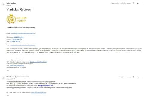 Один человек оставил свой отзыв о том, как шарлатаны брокерской кухни Golden Invest Broker выманили у него около трех тысяч долларов. Аферисты продумали все до мелочей и вначале приставили клиенту аналитика, который смог заработать для него 9832 долларов. Явно это было сделано для видимости, чтобы человек вложил еще больше, но ситуация работала в другую сторону и он попросил вывести деньги обратно себе на карту. Аферисты спохватились и стали рассказывать об условиях вывожа согласно Британскому законодательству. Они попросили заплатить несуществующему регулятору 3 000 долларов, чтобы они закрыли глаза на то, что счет недавно открыли, а уже такая огромная прибыль. Хорошо, что жертва лохотрона не повелся на обманку конторы и начал процесс вывода средств через чарджбек. Можем пожелать ему удачи!
