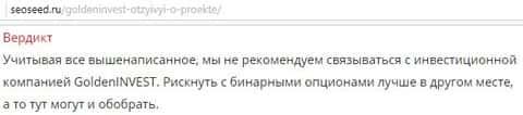 Согласно статьи, которая описана на одном интернет-портале под названием seoseed ru, брокерская кухня Golden Invest Broker накосячила в своем оформлении так, что даже невооруженным глазом можно понять, что они своим клиентам втирают какую-то дичь. Не смотря на эти замечания и описания, судя по отзывам в интернете, жулики умеют убеждать людей и в обществе столько лохов, что за счет их подобные кухни будут работать как минимум 50 лет. Вот что людям нужно сказать, чтобы они не велись на огромные проценты, уговоры звонарей и богатое будущее при работе с брокером? Людям нужен азарт и пару раз попасться в ловушку к мошенникам и вот тогда, может быть, до них дойдет то что мы пытаемся донести. А так в общей сложности, уже многие интернет-ресурсы о лохо-проектах, уже давно очернили и без того черную кухню Голден Инвест Брокер.