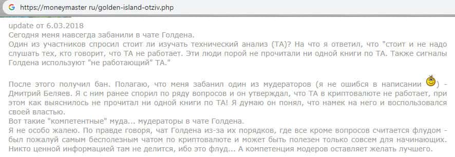 Так же, пользователь рассказывает о том, что он был забанен в чате мошеннической конторы Голден Исланд за то, что дал совет одному из пользователей, работающих в данной шарашкиной конторе. Утверждается, что его забанил один из модераторов, с которым он ранее спорил по поводу того же ТА. Но модераторам плевать, на своих пользователей.