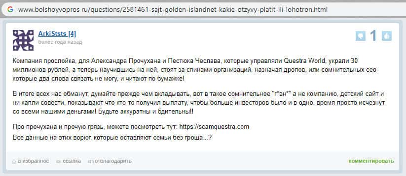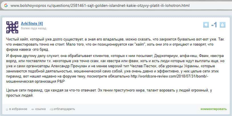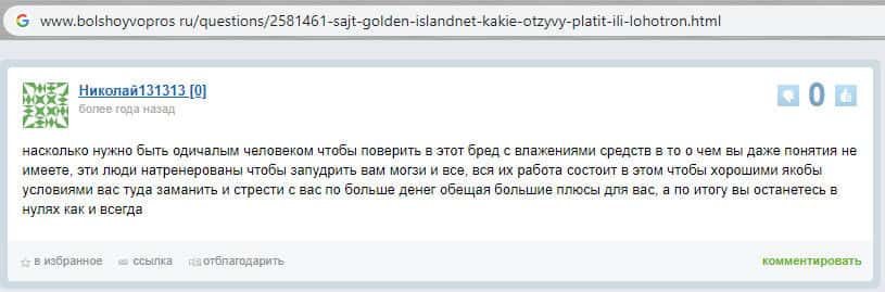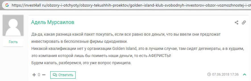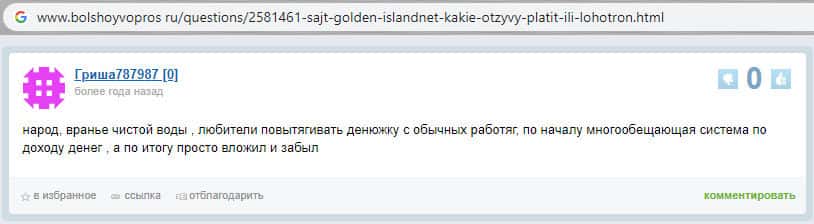 - Гневный комментарий от пользователя на известном форуме о шараге Голден Исланд